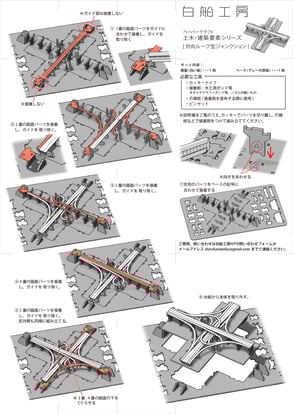 ・組立てが簡単にできるよう台紙と道路パーツに取付けガイドがついています。